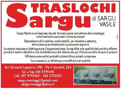 TRASLOCHI SARGU srl¨ un'impresa che opera nel settore dei traslochi dal 2000 con personale esperto nel settore dei traslochi nazionali e internazionali.